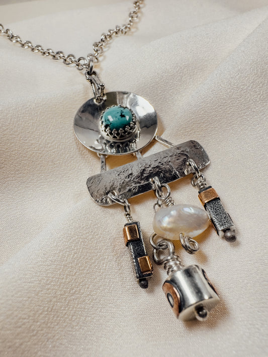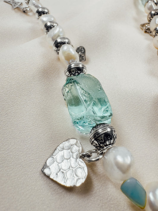 Elegant Pearl & Ice Quartz Necklace with Sterling Silver and Turquoise Cross